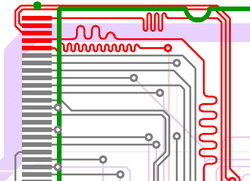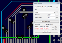 The length matching tool allows the user to route and edit copper traces according to required length and tolerance values that are recalculated in real time.